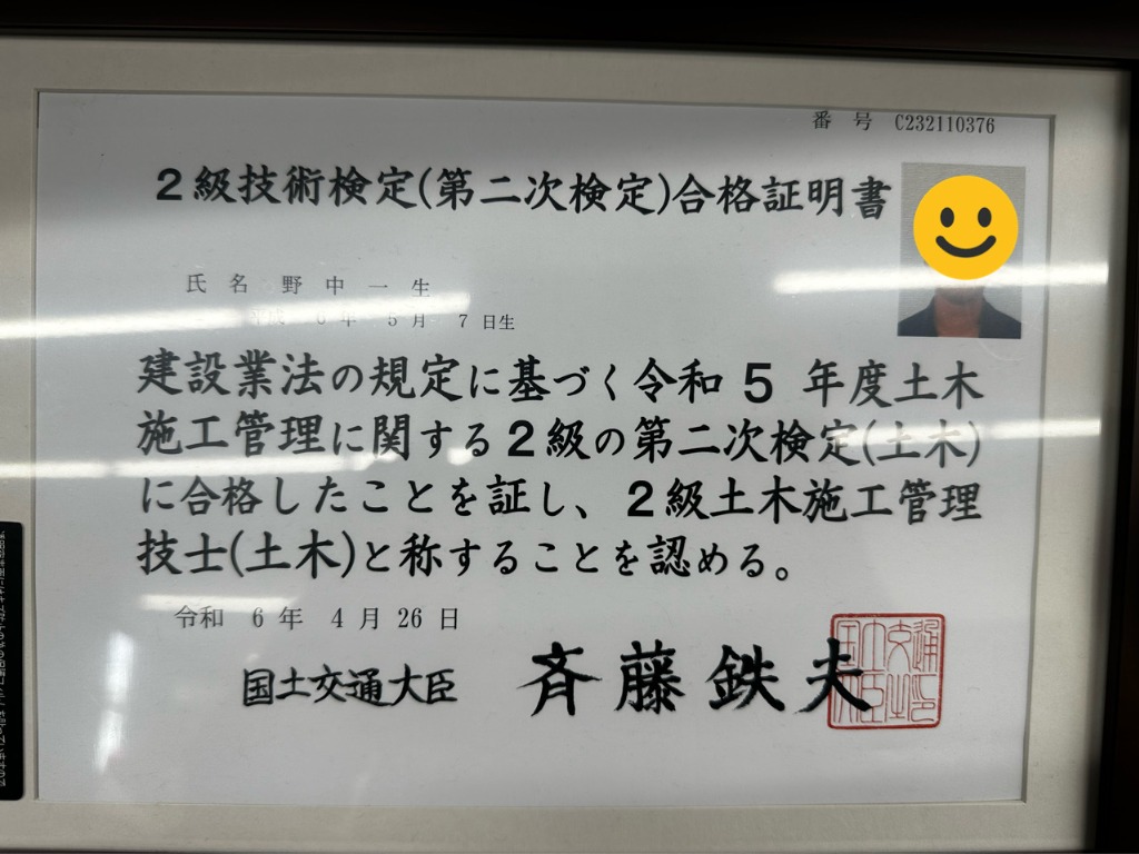 この度皆様のおかげで2級土木施工管理技士の資格に合格致しました